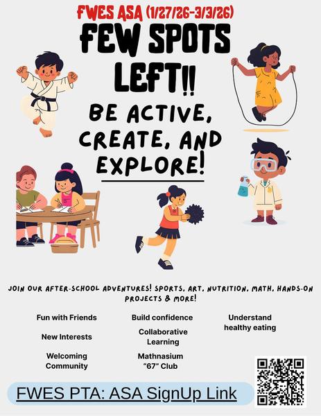 ASA Registration is OPEN and we have a few spots left! You can sign up for a class via our PTA Store. What is ASA? FAQ can be found at our Website.