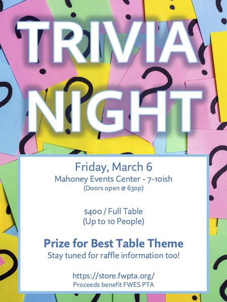 FWES Trivia Night is March 6th — don’t miss the fun! Registration opens today at noon!